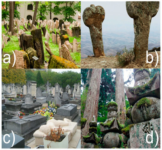Type of cemeteries. (a) Jews are not allowed to remove the tombstone. When extra cemetery land is not available, soil layers are placed on the existing graves, the old tombstones are taken out and placed upon the new layer of soil. Old Jewish cemetery, Prague (photo courtesy A. Meijer). (b) The body of deceased Muslims are placed in the grave without a casket, lying on their right side, and aligned perpendicular to the Mecca. Shadow on the grave soil is not allowed. Khalid Nabi cemetery, Golestan, Iran (photo courtesy E. Mohsen). (c) A burial of a deceased Christian person occurs in consecrated soils. Christians, in particular Orthodox churches, are commonly opposed to cremation. Montparnasse cemetery, Paris, France. (d) In Buddhism, forest burial began from 500 AD. The choice of burial or cremation is strictly a personal choice. Okunoin cemetery, Mount Kōya, Wakayama, Japan (photo courtesy M. Takeshi).