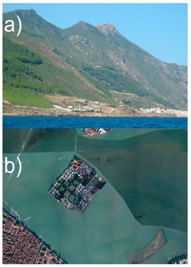 (a) The cemetery of Marettimo, Italy facing the sole human settlement in this 12 km2-wide island. The cemetery wraps 5% of the artificially sealed soils of the island. (b) The cemetery of San Michele, Italy entirely occupies the homonymous island of the Venetian lagoon between Venice and Murano (Google Earth image).