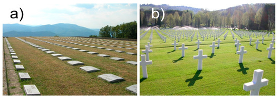Cemeteries sometimes go well beyond their basic role of disposing corpses, making themselves a priority in land use. That is the case of commemoration cemeteries (Figure 4), a collective historical memory, presumably a warning to avoid the tremendous mistakes of the past, being however controversial in the attempt to hide the pain of the past [50,51]. War memorials were erected not only in attempts to ‘fit in’ with these existing and traditional spaces of commemoration, but also to alter and create new spaces, which inspired later commemorative strategies [52].