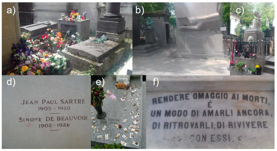 The tombs of (a) Jim Morrison, (b) Oscar Wilde, (c) Fryderyk Franciszek Chopin at the cemetery of Père-Lachaise, (d) Jean Paul Sartre and Simone De Beauvoir, (e) Jean Seberg at the cemetery of Montparnasse, two of the most visited places in Paris. A plaque (f) inside La Recoleta cemetery in Buenos Aires says “paying homage to the dead is a way to love them again, find them, relive with them”.