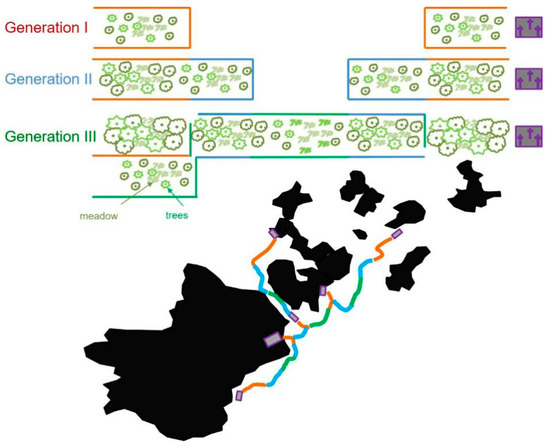 Schematization of an idealized linear linkage between existing cemeterial areas. Densely urbanized areas (black) are normally required by legislation to plan urban cemeteries, enclosed within a perimeter of walls (violet). Starting with the generation I, or cohort I, with an average length from 20 years to 30 years, the succession of generations can undertake the passage from the urban cemetery towards garden cemeteries that use landscaping in a park-like setting. After two generations (generation III), in which direct contact between the living and the dead no longer exists and there are no more health problems due to the burial of corpses, the first expansion areas (generation I) preserving the memory of the dead (for example in trees, where religious beliefs allow it), can become recreational areas for mixed use. A community-based choice must accompany the planning of the expansions. For example, creating areas without trees where the religious belief includes burials that can never be in the shade.