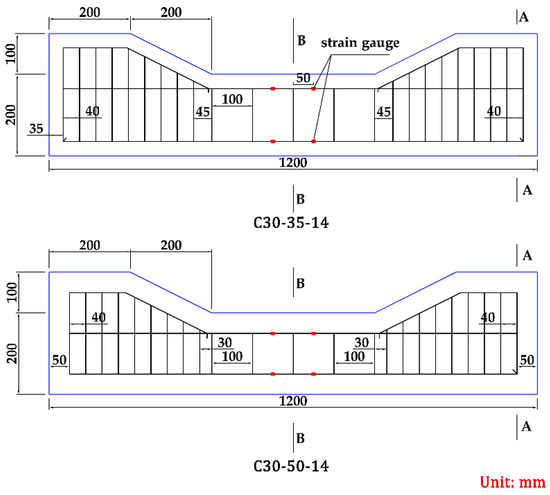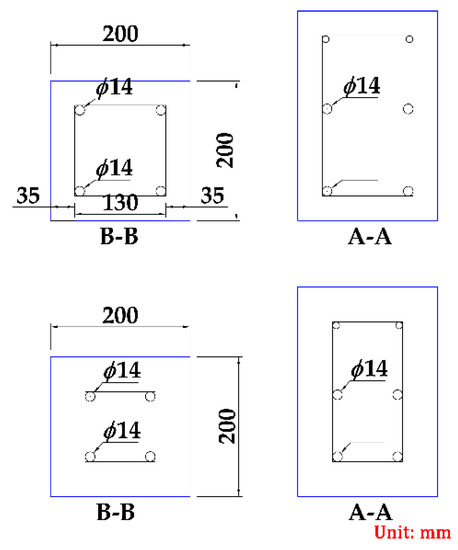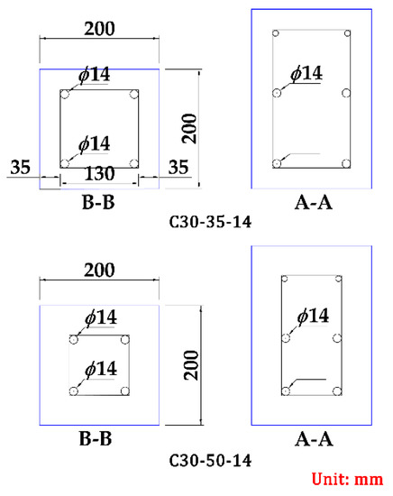 For the main reinforcement, the length of 420 mm is adopted for testing and measuring the slip value of the free end; as for the stirrups, the rectangular closed frame form is adopted, and the spacing is different based on different steel bars. In order to avoid corrosion, the stirrups and the main reinforcement are separated. The anchorage length is chosen to be 4 times of the diameter of the steel rebar, mainly to prevent the steel rebar from yielding under the action of the pull-out load. The specific sizes of the test pieces are as shown in Figure 10. The test piece numbers are C30-10 and C30-14, respectively.