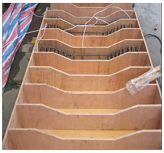 The sizes of the reinforced concrete compression-bending test pieces used in this research are as shown in Figure 1 and Figure 2, and the concrete casting mold is as shown in Figure 3. The concrete beams are equipped with sufficient stirrups to ensure the bending failure of the beams instead of shear failure. After the curing of test piece is completed and the initial corrosion current density is determined, the anode is started to pass the current of the specified strength and time. This process is implemented by an ammeter and a DC power supply. The ammeter is used to measure the current. The concrete specimen is placed in a container containing 5% NaCl solution, so the bottom of specimen can just be in contact with water. The direction of current flow is adjusted, so the rebar in concrete beam act as anodes, and the stainless steel plates, which covers all sides of the test piece, placed on concrete beams act as cathodes. This arrangement makes the current uniform throughout the entire length of rebar.