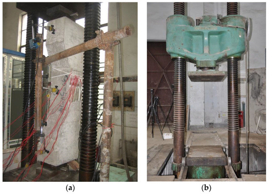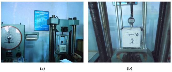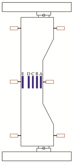 In order to test the strain value in the middle of the concrete, five paper-based strain gauges are arranged at both sides of the middle part of the concrete, respectively, in the tension and compression zones of the concrete (as shown in Figure 5). To test the lateral displacement of the members, three displacement meters are arranged at the front and back sides of the members, which are located at the upper and lower surface of the test piece at a distance of 10 cm and in the middle of the test piece, respectively, so as to study the deformation performance of the member under loading and to compare the changes before and after corrosion (as shown in Figure 5). The measurement with the displacement meters is not only helpful to obtain the lateral displacement change of the member, but also helpful to accurately estimate the ultimate bearing capacity of the member, that is, if the load increases slowly or even decreases, while the displacement value still rises sharply, then this load can be considered as the ultimate value of the member. Also, the test shows the structural capacity under compression with large eccentricity.