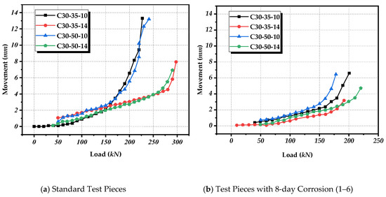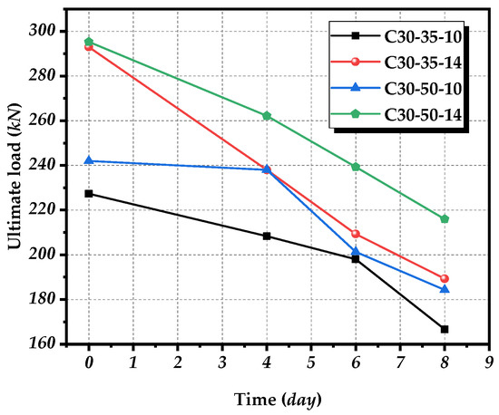 Based on the data analysis of the test results in Figure 7, Figure 8 and Figure 9, it can be shown that: With the deepening of the corrosion degree of the steel bars, the bearing capacity of the members decreases continuously. The average ultimate load of C30-35-10 group test pieces is 227.33 kN under non-corrosion condition, and the ultimate bearing capacity of C30-35-10 group test pieces is only 166.67 kN under accelerated corrosion condition for 8 days, with a decrease by more than 26.63%. At the same time, it can be clearly found that the bearing capacity decline under corrosion condition for 4 days is significantly greater than that in the later period. The ultimate bearing capacity of C30-35-14 group test pieces decreases by 21.05% after four days of accelerated corrosion, decreased by 28.56% after six days of accelerated corrosion compared with that of non-corroded test pieces, and 35.38% after eight days of accelerated corrosion. According to the analysis of the causes, with the increase of days of accelerated galvanic corrosion, the corrosion degree of the steel bars increases gradually, the effective section and strength of steel bars will decrease gradually, due to which the bearing capacity of the steel bars will also decrease continuously. This process conforms to the rule that the bearing capacity of the reinforced concrete structure will gradually change with the corrosion of the steel bars.