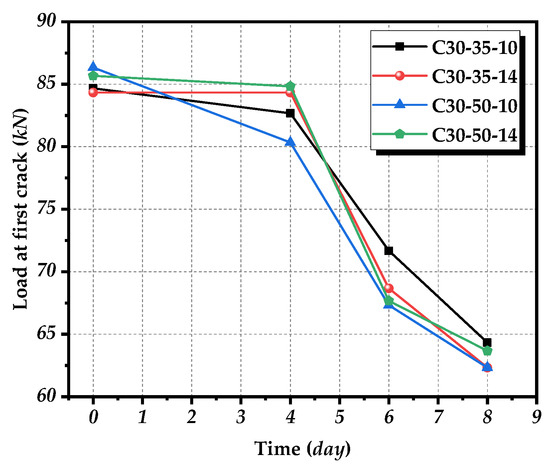 For the overall analysis of the test pieces, based on the initial cracking load and the ultimate load of the test pieces obtained in the compression-bending test, the test data of the test pieces are shown in Figure 7, Figure 8 and Figure 9. Three sets of tests are conducted for each test piece, so the data presented is the average value of the data obtained from the three sets of tests. Among all the test pieces, the data of some specific test pieces is totally inconsistent with the test rules, especially the cracking load. Due to the construction technology, the internal concrete tamping degree and the errors of manual observation and record, there are some errors in the results, and such values are not taken into account.