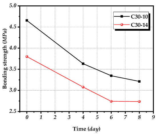 Taking standard parts as an example, the bonding strength of C30-10 group test pieces is 4.66Mpa, while strength of C30-14 group test pieces is 3.80 Mpa, and this rule is also the same in corrosion test pieces. After eight days of accelerated corrosion, the bonding strength of C30-10 group test pieces is only 3.21 Mpa, a decrease of 31.12%, and strength of C30-14 group test pieces is a decrease of 27.89%, only 2.74 Mpa.