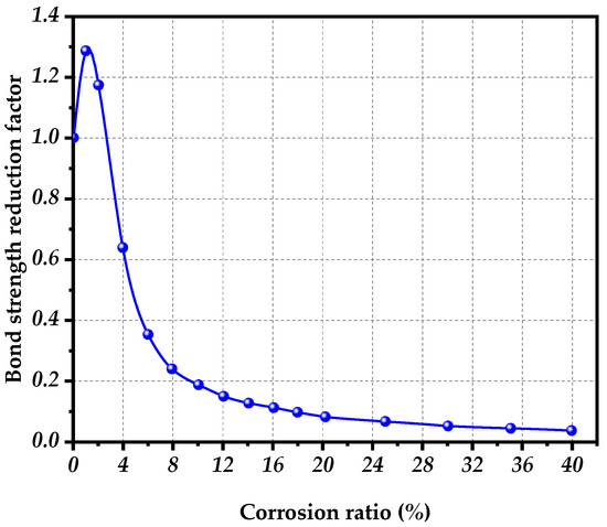 Based on the variation of bond strength between rebars and concrete with the corrosion degree of rebars obtained from bond-slip pull-out tests of reinforced concrete described in Section 3, the bond strength reduction factor, can be selected as shown in Figure 17.