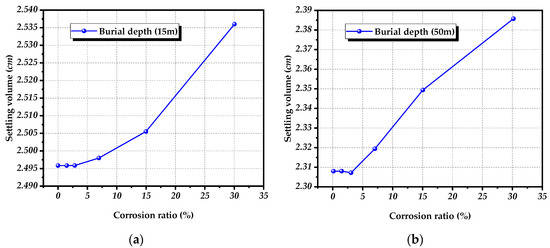 Variation of vault settlement with corrosion ratio under different depth: (a) buried depth 15 m; (b) buried depth 50 m.