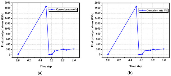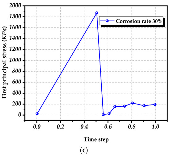 Stress-time step curve of concrete structure: (a) Uncorroded; (b) 7% Corroded; (c) 30% Corroded (time step means calculation step).