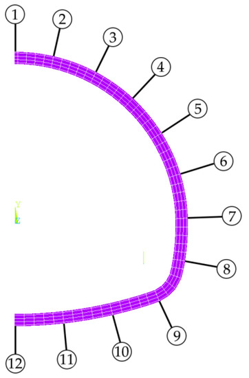 With the increasing corrosion of rebars, the relative dislocation between concrete and rebars in reinforced concrete lining structure will eventually lead to structural failure, which is also the focus of this paper. The relative slips of concrete and rebar at a series of key points (selection of key points shown in Figure 20) along the tunnel circumference are extracted and plotted, to analyze and study the slip state of various parts. The results are shown in Figure 21.
