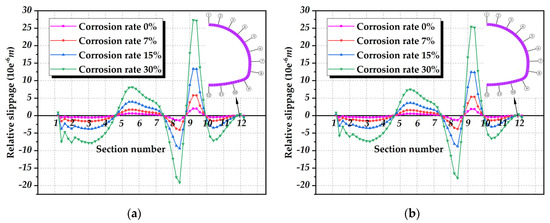Relative slips for characteristic section under different corrosion ratios: (a) 15 m burial depth; (b) 50 m burial depth.