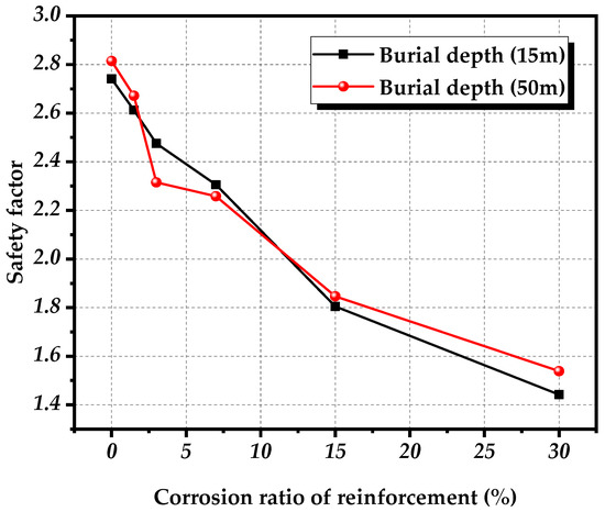 According to the above method, the safety factors of tunnel lining sections under different burial depths and corrosion conditions can be extracted and obtained through computation. The safety factors of the most dangerous sections under different working conditions are analyzed, with the results shown in Table 4 and Figure 22.