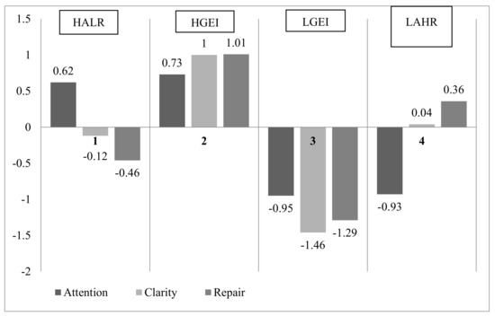 The first specific objective of this study was to identify different EI profiles according to their dimensions (attention, clarity and emotional repair). The cluster analysis allowed us to identify four EI profiles: a first profile with high scores in attention and low scores in repair (HALR), a second profile with high scores in all the EI dimensions (and, as a result, with the individuals presenting a high level of general EI (HGEI)), a third profile with low scores in all the EI dimensions (and, consequently, with the individuals presenting low levels of general EI (LGEI)) and a fourth profile with low scores in attention and high scores in emotional repair (LAHR). These profiles are in line with the results obtained by previous investigations [43,44,45].