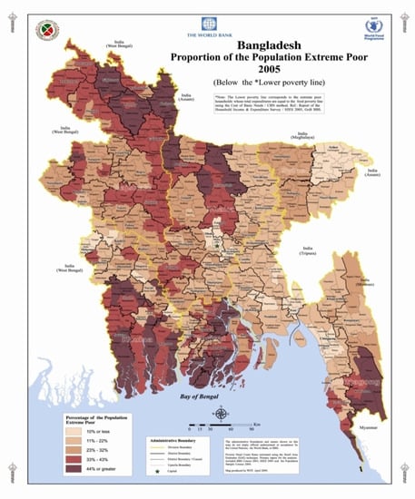 Regions of extremely poor populations (Below the lower poverty line) in Bangladesh.