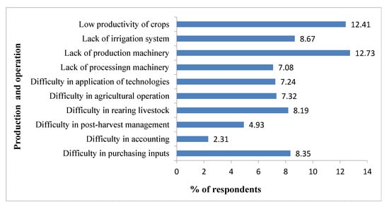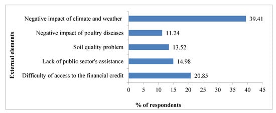 The surveyed farmers faced numerous constraints with regard to agricultural production and marketing. The production challenges that the farmers faced can be grouped into farm-level internal or managerial factors and external factors. With regard to internal/managerial challenges, the survey revealed that lack of agricultural production machinery was the most common constraint faced by respondents (12.73%), followed by low productivity of crops (12.41%), lack of proper irrigation systems (8.97%), and difficulties in purchasing agricultural inputs (8.35%) (Figure 2). Other internal/managerial constraints included lack of application of new technologies, lack of machinery for processing, and difficulties in post-harvest management and accounting. The number one constraints with respect to external factors was adverse impacts of climate and weather (39.41%), followed by difficulties accessing institutional financing (20.85%), and lack of public sector assistance. Moreover, the farmers faced problems with poultry diseases and poor soil quality (Figure 3).