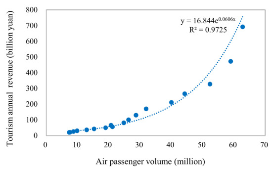 Fitting curves of the relationship between tourism annual revenue and the air passenger volume of civil airports in Yunnan Province from 2000 to 2017.
