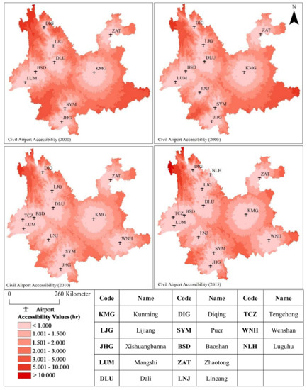 - Highway traffic accessibility around the airports in cities in Yunnan is improving, although the spatial changes are inconspicuous. The time required to travel from airports to tourist locations has gradually decreased over time, and in 2015, 83.41% of tourist locations could be reached within 1.5 h of driving from an airport; additionally, all tourist destinations could be reached within 3 h of driving.