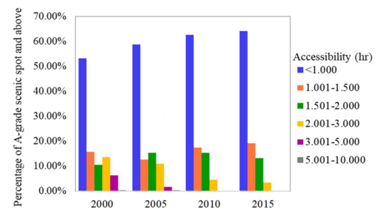 Furthermore, the results of the coverage of A-grade and above tourist locations in each area are expressed in Figure 4, which shows that the airport accessibility values of tourist locations in the province are within 10 h initially and then within 3 h in 2010 and 2015. Additionally, the coverage in the 1.5=h travel time area corresponding to each time node in 2000, 2005, 2010, and 2015 was 68.94%, 71.49%, 80.00%, and 83.41%, respectively. All of these findings indicate that the airport accessibility of tourist locations in the province has increased over time, implying that the road conditions from the airport to these locations have generally improved. Moreover, the evolution characteristics of tourist area coverage at different airport accessibility levels are consistent with the evolution characteristics of the airport accessibility values. The coverage increased gradually in the area less than 1.0 h; decreased in areas of 2–3 h, 3–5 h, and 5–10 h; and fluctuated slightly in the areas of 1.0–1.5 h and 1.5–2 h.