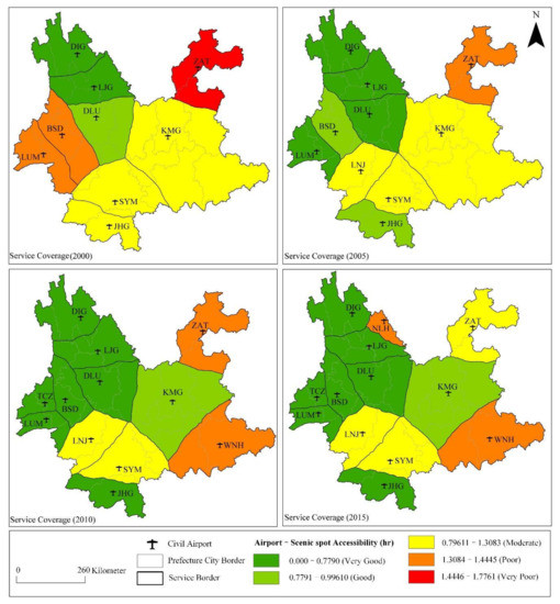 In order to compare and analyze the spatial variances of service coverage in Yunnan civil airports at four time nodes, the method of natural breaks in ArcGIS is used to classify the airport accessibility of tourist locations in 2000. The basic idea of natural breaks method is the clustering algorithm, the termination condition of the algorithm is that the inter-group variance is the largest and the intra-group variance is the smallest. This method is useful to distinguish the variances between each category to a large extent. As a result, the calculation results of airport service coverage are divided into five grades as follows: less than 0.7790 h, 0.7791–0.9610 h, 0.9610–1.3083 h, 1.3084–1.4445 h, and 1.4446–1.7761 h, denoting excellent, good, average, poor, and terrible, respectively. Figure 5 shows the visualization results of the service coverage of Yunnan civil airports in selected years, including the service scope and accessibility.