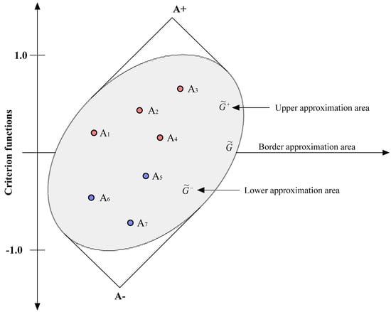 [21] Alternative could belong to the border approximation area upper approximation area or lower approximation area that is . The presents the area where ideal alternative is located while the presents the area where the anti-ideal alternative is located . Illustration of areas and alternatives are shown in Figure 1.