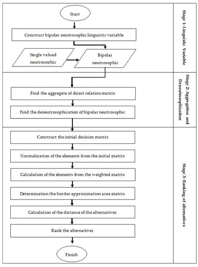 In this section, computational procedures of the proposed method are presented. The proposed method comprises three stages where in the first stage, the new linguistic variable for bipolar neutrosophic set is proposed. In the second stage, we utilize the bipolar neutrosophic weighted aggregation operators to aggregate the direct relation matrix and deneutrosophication for bipolar neutrosophic is introduced to find the crisp number. Finally, in the third stage, we rank alternatives based on distances between alternatives and BAA. Figure 2 presents the overall framework and stages of the proposed method.