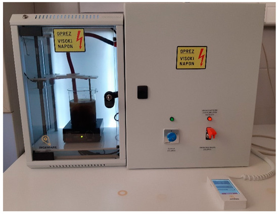Since there are many custom-made devices that are used in research and some of them are well described by Takaki et al. [56], only the high voltage electrical discharge device (Figure 1) that was custom made for Faculty of Food Technology Osijek by Ingeniare CPTS1 is described in this subsection as an example. The pulse generator of high voltage contains a 30 kV impulse generator with a variable pulse frequency of 20 Hz to 100 Hz. The impulse generator can be replaced so that the voltage can be adjusted according to the needs of the experiment. The generator scheme (Figure 2) shows that it consists of a high-voltage DC generator, an energy tank (capacitor), a high-voltage switch, a chamber, and an automatic control unit. The automatic control unit provides capability to control time of treatment, pulse frequency, and mixing speed.