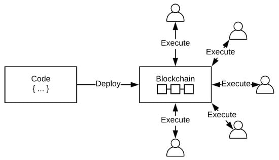 Transactions on the Ethereum blockchain can be created either externally or by smart contracts, introducing the concept of functions to the blockchain []. Smart contracts are programs that are recorded and verified on the blockchain (Figure 2). Once the contract is deployed, its code cannot be altered, thus ensuring that the initial conditions will always be respected for any future executions. Just like real world contracts, a smart contract on the blockchain is created between two parties and is executed once some triggering event is set, such as a deadline or a specific target value being reached. In [], the architecture and applications of blockchain smart contracts are described.
