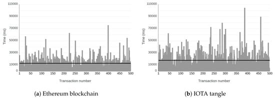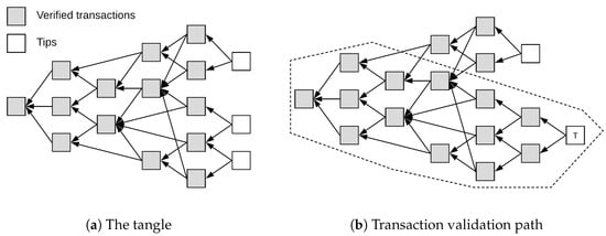 The IOTA network was specifically designed with IoT applications in mind, proposing a different method of organizing the transaction data, by using a directed acyclic graph (DAG) instead of a linear blockchain. The IOTA DAG is often referred to as the tangle. Its main characteristic is that it allows zero-fee and zero-value transactions [] (Figure 3a).