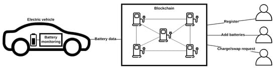 The proposed battery swapping and charging system is described in Figure 4. Each EV will have an on-board computer, which will monitor the battery data and send the information to the BMS application. Since the on-board computer may not have sufficient resources for computing the POW hashing functions, the charging stations will act as peers on the implemented blockchain and the transactions will be handled by the stations (computing the necessary POW).