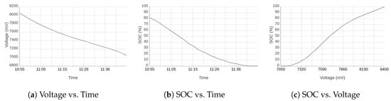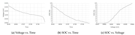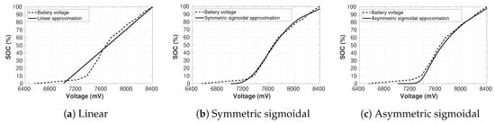 To extend the life of the battery pack and to avoid deep discharging of the battery [], it is recommended to remain outside the highlighted area. The data were mapped with a minimum safe battery voltage () of V/cell ( V/cell for two cells and V/cell for three cells). Three approximations [] were considered: linear, symmetric sigmoidal, and asymmetric sigmoidal.