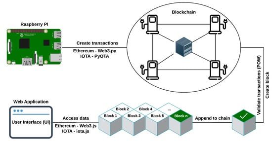 The microcontroller transmits the data to the Raspberry Pi via I2C communication. The data are averaged over a series of 60 samples and the blockchain transaction is created. The anatomy of the transaction depends on the blockchain implementation and will be detailed in the following sections.