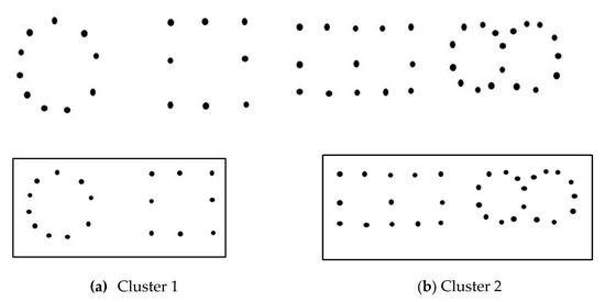Clusters formed from four distinct objects based on their topological features. (a) Cluster 1 consisting objects with one hole. (b) Cluster 2 consisting objects with two holes.