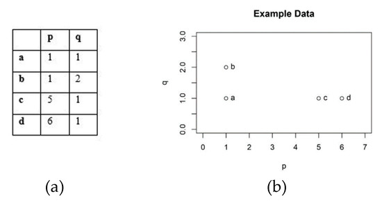This produced the dissimilarity matrix, N × N matrix with Dij representing the dissimilarity distance between two z-dimensional points: and . It must be noted that for the same observations in which , the distance was Dij = 0. Figure 3 shows an example of data with four observations a, b, c, and d and two variables (), p and q were used to illustrate HACA calculations.