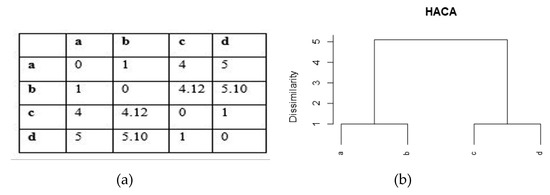 The dissimilar distances between the observations a, b, c, and d were calculated using the Euclidean distance. For instance, the distance between the first and second observations, a and b was equal to D12 == 1. For the distance between the same observations was D11 == 0. The dissimilarity distance matrix was 4 × 4 for the data in Figure 3, as shown in Figure 4a. Two clusters were formed with a and b in the same cluster while c and d were from the other cluster. This was because they had a minimum distance of D12 = D34 = 1. Complete linkage was used to determine the next cluster. The distance between the two clusters was determined by the distance between the two farthest-apart members Therefore, it was the distance between the second and the fourth observations, b, and d, respectively, which was D24 = 5.10. This was the final step of the HACA process where a cluster was formed from the linkage consisting of all observations: a, b, c, and d, and the closest members were placed in the same cluster. The results of HACA was displayed in the dendrogram, as shown in Figure 4b. This began with four observations, which formed four singleton clusters. Then some links that joined those clusters with a height equivalent to the dissimilar distance, which joined the two closest clusters. From the HACA example above, it was apparent that the clusters were determined by the distance calculated based on the value of the data. It was a very straightforward calculation without any alteration to the data. However, other characteristics including topological features can be extracted from the data and this information can provide a new direction for the HACA technique. Thus, this study was conducted to investigate the effectiveness of combining HACA with topological features.