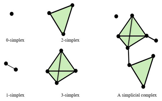 Persistent homology was applied to the point cloud data produced by applying Takens’s theorem on time series data of . A point cloud data was represented by the unordered sequence of points in Euclidean m-dimensional space [42]. In this study, a point cloud is formed by transforming a 1-dimensional daily time series , where n is the number of days in a particular month by using Takens’s theorem with time delay and embedding dimension and yield 3-dimensional data (in ). For instance, the first row of the time series data represented by is transformed to , second row with and so on. Topological features were obtained by applying persistent homology on simplicial complexes constructed from point cloud data. Construction of a simplicial complex was done using simplices as building blocks with several rules applied in the process of construction. Since this study used point cloud data with dimension 3, low-dimensional values of k-simplices was used to build up simplicial complexes with 0-simplices representing points or vertices, 1-simplices representing lines or edges, 2-simplices representing triangles and 3-simplices representing tetrahedra (Figure 5). The first rule in the construction is to draw a circle with radius for each point in a point cloud. Second, when the radius increased with two circles intersecting with each other, a line is drawn connecting two points. These rules build the simplices and the combination of simplices yields a simplicial complex. The radius of the circles is also known as the filtration value and the evolution of topological features is captured for each filtration stage. To construct simplicial complexes in this study, Vietoris-Rips (VR) complexes were used where the distance of any two vertices in k-simplices must be less than or equal to [23].