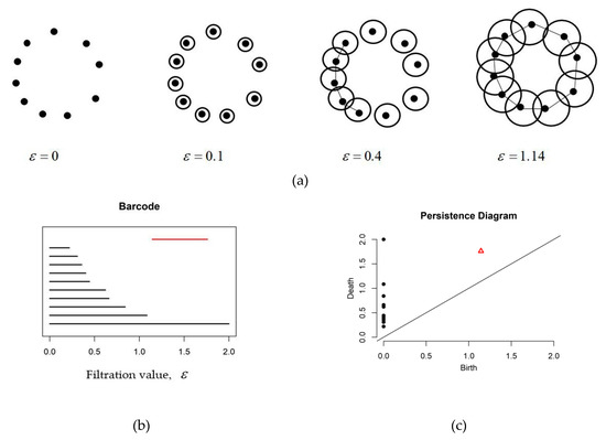 Persistent homology is a tool in topological data analysis (TDA) used to extract qualitative features or specifically known as topological features from data sets, and such features are formed across multiple scales [21,22]. Topological features which are the hidden features in the data sets are described by the numbers of components and holes. The points in the data sets are gradually joints up by lines drawn between them and this process will yield components and holes that approximate the shape of the data. The transitions from points in data sets to components and holes provide new kinds of information for data structures in the topological sense that were not readily available in the data [23]. Furthermore, the robustness of persistent homology in addressing noise, high-dimensionality, and incomplete data provide new insights in addressing the complexity of data [22]. Exploration of persistent homology has been done in various fields such as identification of breast cancers [24], robotics [25], and brain networks [26] (see [22] and references therein).