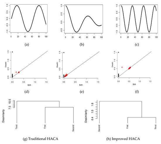 The first, second, and third series (, , and ) series (a–c) and their respective persistence diagrams (d–f). Results of traditional HACA (g) and improved HACA (h).