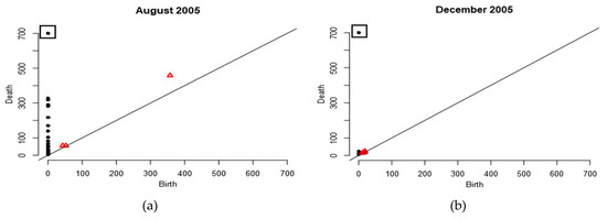Figure 8 illustrates persistence diagrams between a month with haze (August 2005) and a month without haze (December 2005). Decembers often receive abundant rainfall during the Northeast monsoon in Malaysia [48]. This rainfall helps to eliminate particles from the earth’s surface [49]. The death points (vertical axis) of components (black dots) and holes (red triangles) for months with haze were higher than of months without haze. In Figure 8b, the features ‘died’ at the early filtration stage features compared to features in Figure 8a. This suggested that the months without haze had short lifetimes of topological features. Therefore the computations were able to distinguish between haze and without haze conditions. At the final filtration stage, only one component (small square) was left and this feature would exist for any other filtration value. In analyzing the topological feature, this feature was excluded for all persistence diagrams to avoid dominance against other features. The analysis of topological features was conducted for all persistence diagrams. Then HACA was applied based on this analysis.
