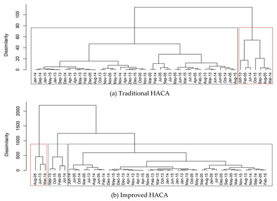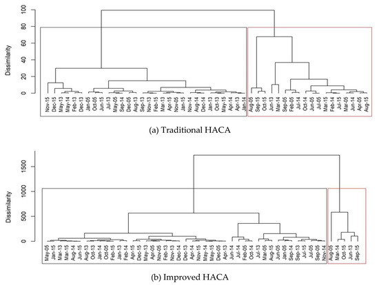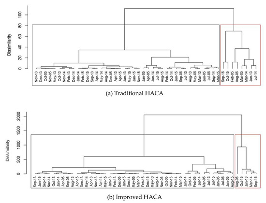 The results of HACA for the two approaches were displayed in dendrograms alongside the similarity between months observed. Figure 9 shows dendrograms (traditional HACA and improved HACA) for Klang station. The vertical line in the dendrograms represented the dissimilarity in distance between clusters. When the dissimilarity values were higher, the differences between the clusters were more pronounced. From the clusters formed by the traditional HACA approach, two clusters were selected with one of the clusters consisting of various months with haze. In 2005, a short period of haze occurred in February, and on July 2014, the 24-hour concentration had exceeded MAAQG in a few days of that month [37,38]. In the traditional HACA approach, the months with haze belonged to the same cluster, but in the improved HACA method, the months with haze were separated between two clusters. Through the improved HACA approach, the severe haze months (August 2005, June 2013, and March 2014) and moderate haze months (February 2005, July 2014, September 2015, and October 2015) were successfully divided into two clusters.