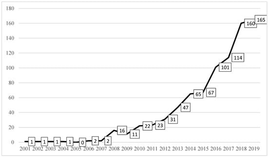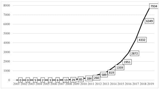 Czakon [61] claims that the dynamics of change in the number of publications may be a manifestation of a stage in the research field life cycle. Therefore, analyzing these trends contributes to better understanding of the field evolution. Among 839 publications included in the research sample, the earliest one dates back to 2001. Nevertheless, until 2007, only one or two publications were issued per year, which could have been recognized as weak signals of the upcoming interest of academia in researching the issues related to sustainable supply-chain management. Between 2008 and 2015, the number of publications per year increased from several to almost 70. This period can be considered as the emergence phase of the research field. Then, in the second half of the 2010s, dynamic growth in research productivity has been observed as the number of publications increased from the level of around 100 in 2016 to 165 in 2019. Graphical illustration of the growing trend in the number of publications in the research field is presented in Figure 1. The dynamics of the increase in research productivity focused on sustainable supply-chain management is even more visible when the number of citations is taken into account (cf. Figure 2). Very limited in the 2000s, this measure increased by ten times between 2010 and 2015. In the second half of the 2010s, the growing trend has been maintained, and the measure attained almost 8000 citations in 2019.
