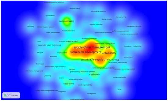 The study by Zhang and associates [62] confirms that author keywords and keywords added in the process of publications’ indexation in databases are equally effective for bibliometric analysis aimed at exploring the structures of research fields. Therefore, we employed both categories of keywords for the co-occurrence analysis within the research field related to sustainable supply-chain management. In total, 839 publications included in the research sample provide 3599 keywords. Among them, those which occur the most often are: ‘supply-chain management’ (510), ‘sustainable development’ (349), ‘sustainable supply chains’ (341), ‘sustainable supply-chain management’ (315), ‘sustainability’ (263), ‘decision making’ (101). The prominence of the aforementioned expressions is easier to observe with the item density visualization of high-frequency keywords in the sustainable supply-chain management research field (cf. Figure 3).