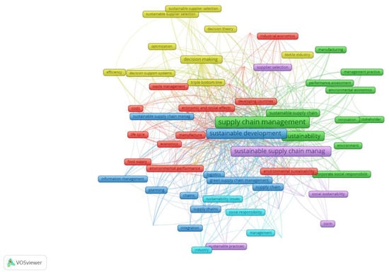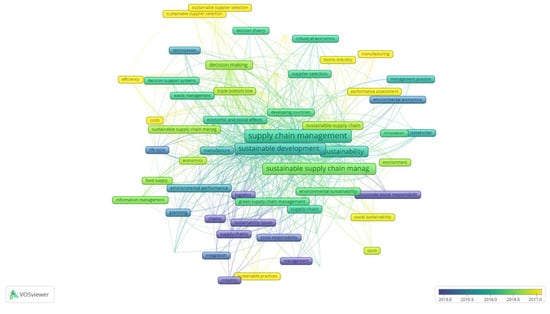 Overlay visualization of high-frequency keywords in the sustainable supply-chain management (SSCM) research field. Source: Own study based on data retrieved from the Scopus database and analyzed with the use of the VOSviewer application (27 December 2019).