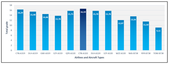 Overview of the overall ratings results of the selected aircraft and airlines after conducting a horizontal assessment at Zagreb Airport in the period between 11:00 and 11:59.