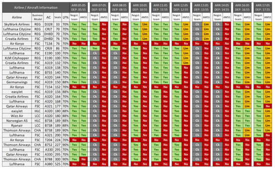 Following the vertical and horizontal assessment, the correlation of results, and considering all the limitations, the final results of acceptance or rejection of the proposed airlines and their aircraft during the period in question were identified (Figure 8). The results obtained through the AMSS indicate that, although these 12 aircraft are very similar, the introduction of any of them could cause delays in the existing traffic. Delays would be caused by the lack of airport infrastructure capacity or the ground handling equipment availability needed by certain airlines’ business models. For example, problems may arise from the high occupancy rate on low-cost flights and insufficient capacity of the passenger terminal, or from adequate equipment not being provided for handling network airlines’ aircraft.