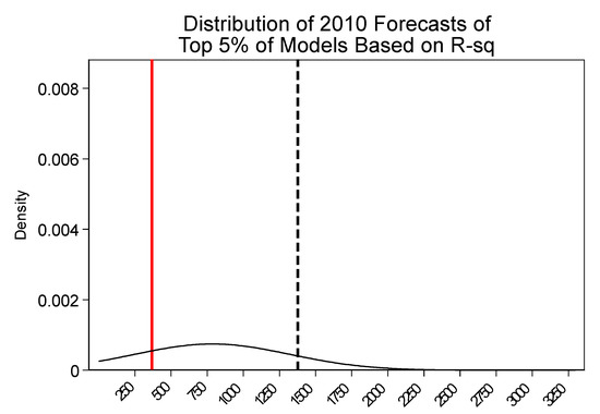 Distribution of the 2010 forecasts generated by top (highest) R-squared models around the actual value (red solid line). The average of the forecasts are denoted by the black dotted line.