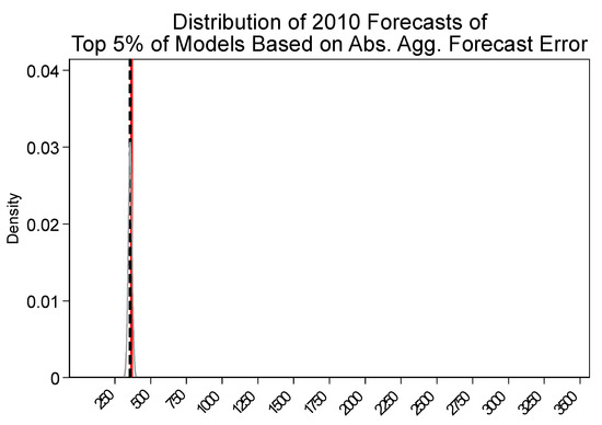 To provide further visual insight, Figure 3 and Figure 4 show the actual aggregate (represented with the red spike) and the histogram of the aggregate of forecasts for the models that are within the top 5% of the R-squared and absolute aggregate error criteria for year 2010. The graphs for the other years have very similar characteristics. They are provided in Figure A2 in the Appendix B.