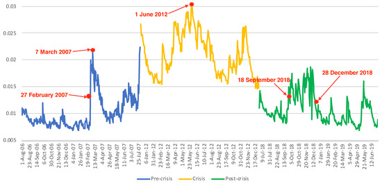 According to the discussion of the estimation of CES in Section 2.3, the best factor copula based on GJR-GARCH models and weights was applied. Therefore, 10,000 simulations were generated and the global financial risk, represented by CES, was computed. Figure 1 describes all estimations of systemic risk for all periods, and each period is depicted by a different color. A larger absolute value of the CES during the crisis period indicates higher potential systemic risk compared to the other two periods. During the crisis period, there was a lower probability of having steady predictions and a higher probability of having huge fluctuations. The lack of financial stability and the frequent extreme fluctuations within a short time period are also characteristic of a financial crisis. Not only did the ES predictions perform well in the long run, but also for the extreme values before the slumps. On 27 February 2007, more than half of the main indexes suffered losses. Indexes, such as SPX (United States), S&P/TSX (Canada), DAX (Germany), UKX (England), and SHCOMP (China) dropped by 3.53%, 2.72%, 2.96%, 2.31%, and 8.84%, respectively. Extraordinary slumps for all countries rarely occurred simultaneously. Therefore, the CES predictions for the pre-crisis period increased from 27 February 2007 and reached their peak on 7 March 2007. After a few interventions from each country, potential risk first decreased and then surged at the end of the pre-crisis period. During the crisis period, the highlighted point, 1 June 2012, only 38 of all 42 countries (Saudi’s market was not open) experienced a decrease and all indexes from the G7 group countries declined by at least 1% (SPX 2.5%, S&P/TSX 2.2%, and DAX 3.5%), which led to a large ES. For the post-crisis period, huge fluctuation between 18 September and 28 December 2018 may have been driven by the poor performance of the SPX (United States) and SHCOMP (China). As the two largest economies, by Christmas Eve of 2018, SPX dropped around 19.73% from the peak point on 20 September, while SHCOMP slumped to a four-year low. Another reason may be the slowdown in global economic growth and political instability, such as increasing the tariffs imposed by the American president and rising interest rates by the Federal Reserve. To summarize, the estimation of systemic risk has played the role as an early warning of possible loss in global financial markets.