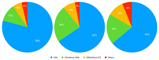 As the United States contributed more than half of the systemic risk in each period, we separated the remaining 42 countries (41 countries in the pre-crisis periods) into three groups, which included G7 (excluding the USA), G20 (excluding G7 members), and others (remaining countries with modified G7 and G20 group as above). Figure 2 describes the average CES% for different groups or countries. Figure 2 shows that the United States accounted for more than 60% of total risk, but the proportion was decreasing. For the G7 group, members of G7 countries had a greater risk level during the crisis period than during the pre- and post-crisis periods. As for the G20 group, the potential risk increased from the pre-crisis period to the post-crisis period. For other countries, they tended to be riskier in the post-crisis period than in the pre-crisis period. Possible explanations for this phenomenon may be due to several aspects. First, the slowdown in the USA economic growth, the decline in the market capitalization gap between the USA and other countries, and the deleveraging process might be the reasons for the decreasing CES ratio of the USA. Following the crisis in the subprime mortgage market of the United States in 2007, European countries, in particular, England, Germany, and France, faced huge losses. Therefore, the G7 group was more vulnerable during the crisis period than at other times. The main factor affecting the rising CES% of the G20 group may be the rapid economic growth of China and the potential bubble in Chinese stock and real estate markets. For the remaining European Union (EU) countries, the unstable political environment including Britain exiting from the EU and bankruptcy of Greece may have driven the increase in the CES ratio.