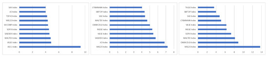 To forecast the systemic risk of the global financial market and countries’ contribution to systemic risk, we performed a one-period ahead forecasting. First, the dataset was divided into in-sample and out-of-sample. Second, GJR-GARCH models were used to filter the stock returns. We employed maximum likelihood estimation (MLE) to estimate GJR-GARCH models for in-sample data, thereby obtaining standardized residuals for each stock market. In this process, we estimated the GJR-GARCH models with different margins, including normal distribution, skewed normal distribution, skewed Student’s t distribution, and skewed generalized error distribution, for each stock index, and the best GJR-GARCH model with margin for each stock index was selected in terms of AIC and BIC. Second, we transformed the standardized residuals into uniform distribution using marginal conditional cumulative distribution functions and plugged them into factor copulas. Third, the maximum likelihood method was implemented to estimate the parameters of factor copulas (see inference function for margins in Joe [23] and Krupskii and Joe [24]). Similarly, the best factor copula was chosen at the one that had the lowest value for both AIC and BIC. Fourth, we drew 10,000 random numbers from the best factor copula, and used the inverse function of the corresponding marginal distribution of each variable to obtain the standardized residuals. Fifth, we forecast the value of each variable at the period using the GJR-GARCH model; thus, 10,000 possible values were generated at the period for each variable. Therefore, the total systemic risk of the global stock market, systemic risk, and contribution of each country to the total financial market risk were calculated by Equations (14)–(16) respectively.